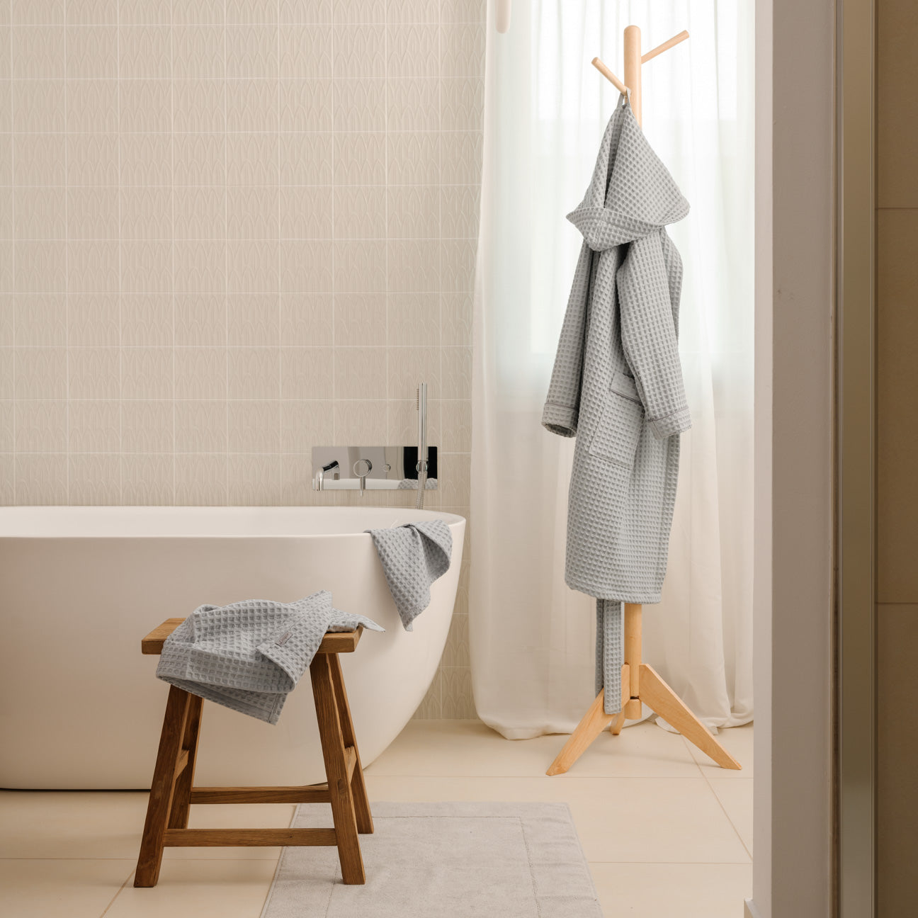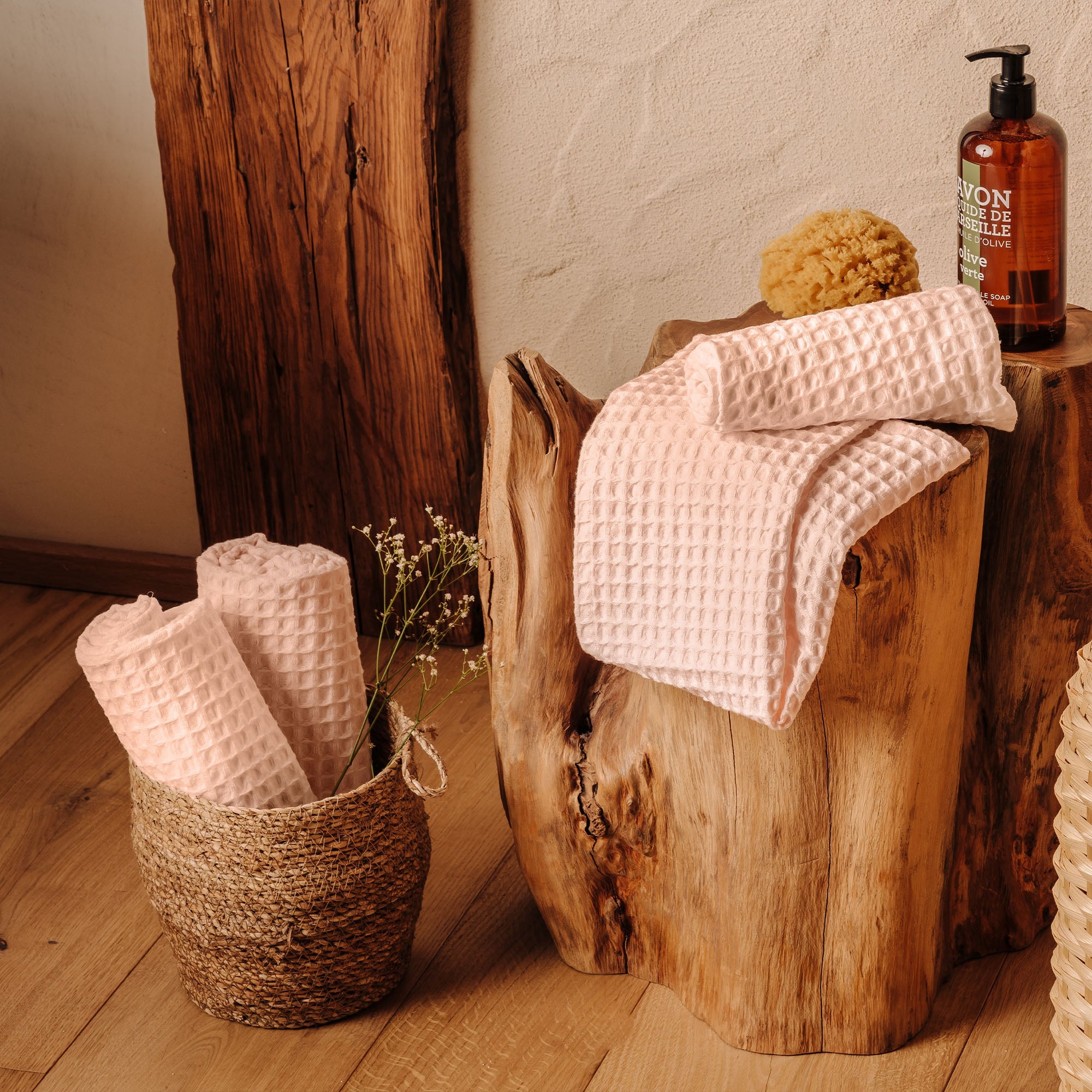 380 gr/m2 of pure cotton. Its wide-knit texture makes it a highly absorbent, durable, and extremely soft towel. Thin and practical, you'll be surprised by how quickly it dries you and itself.