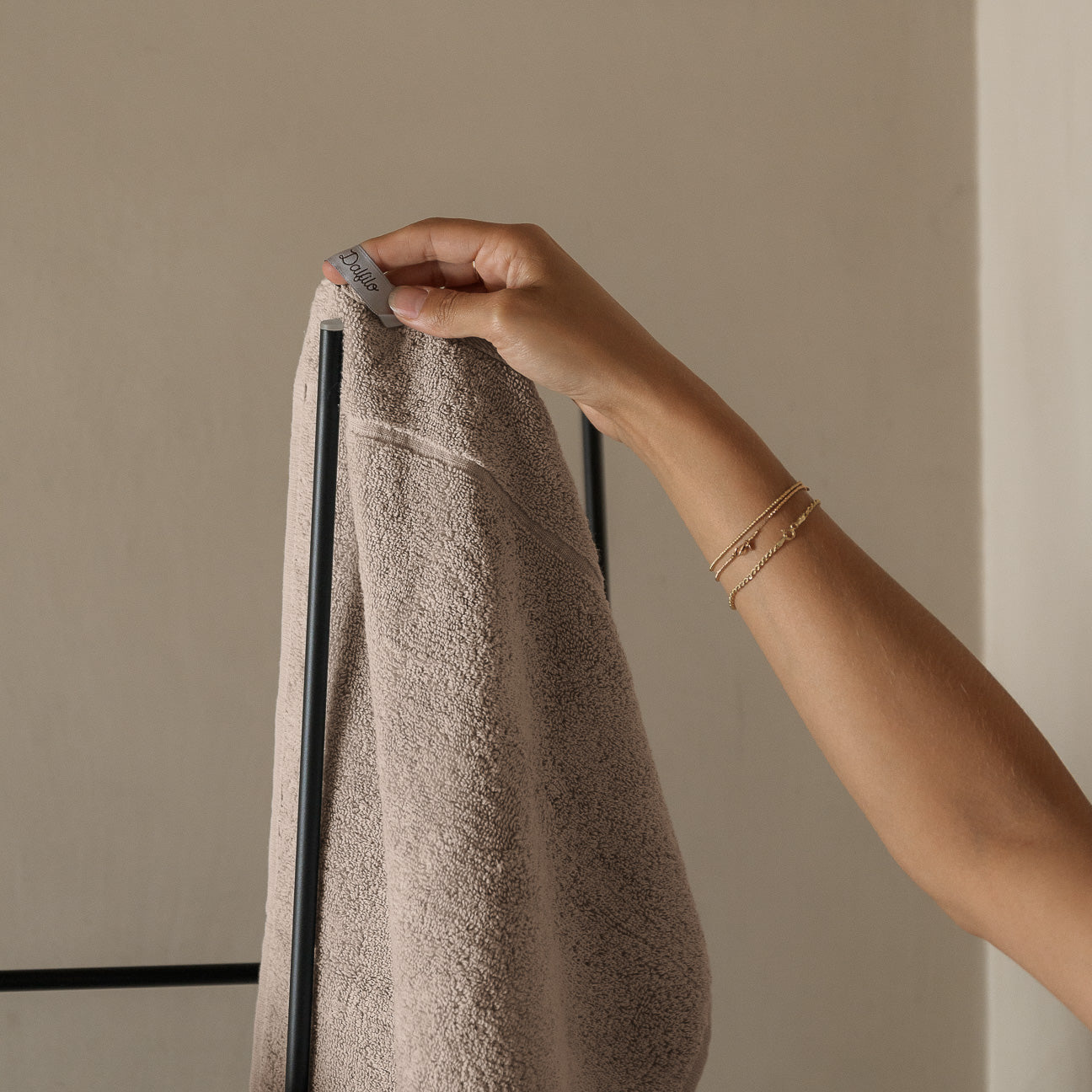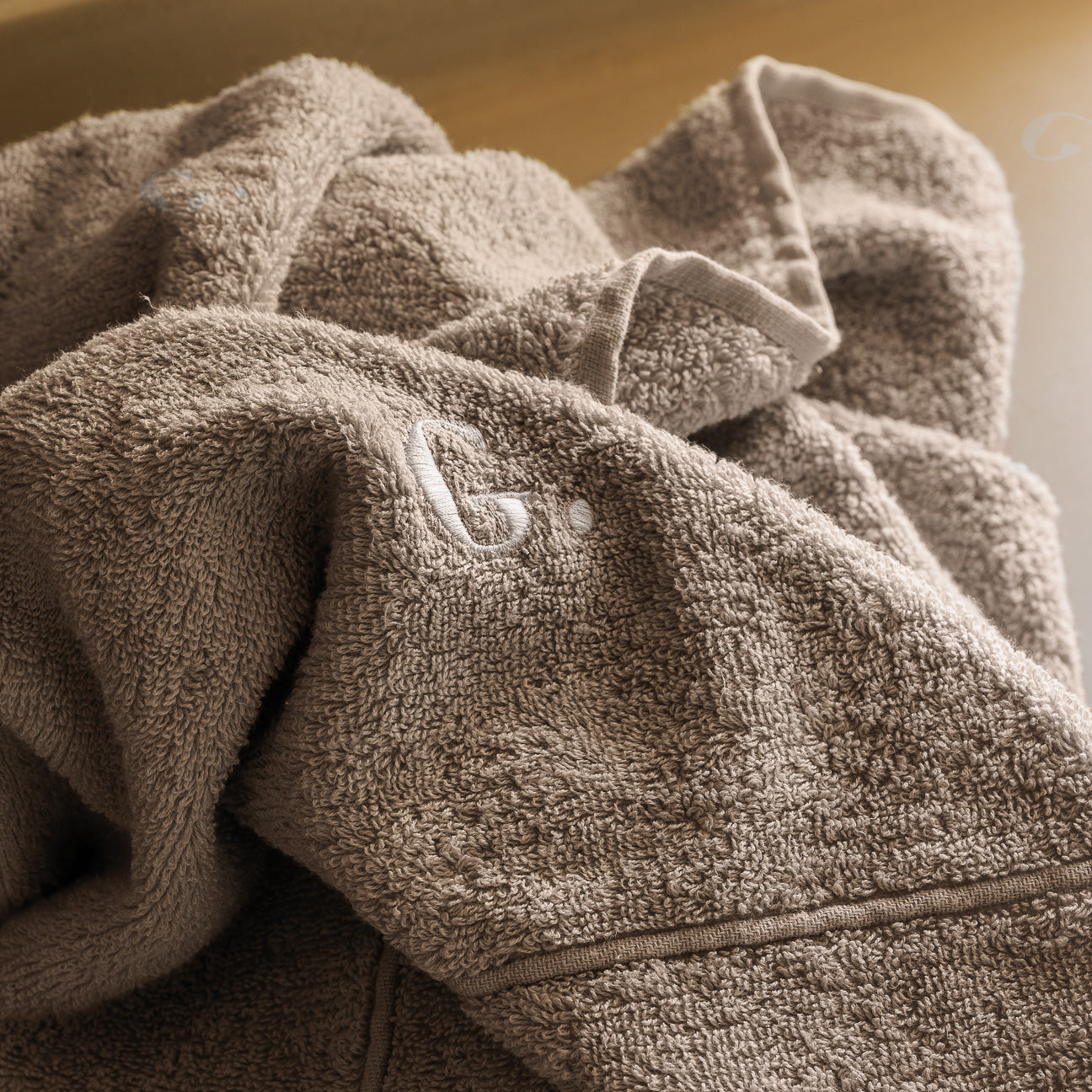 Dalfilo Plush Line is characterised by a pure cotton towelling of 500 g/m2 for towels and 470 g/m2 for bathrobes, produced using a weft and two warps worked to different tensions and coupled with soft-twist yarns. This processing gives the fabric a greater absorbency capacity and unmistakable softness, easy drying and a not excessive bulk.